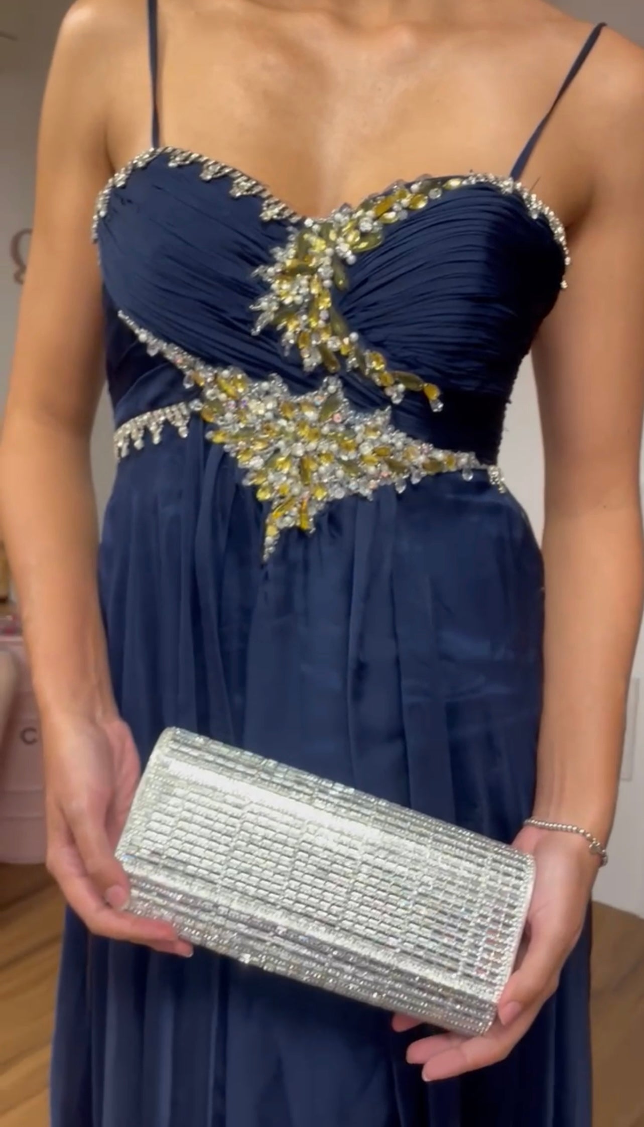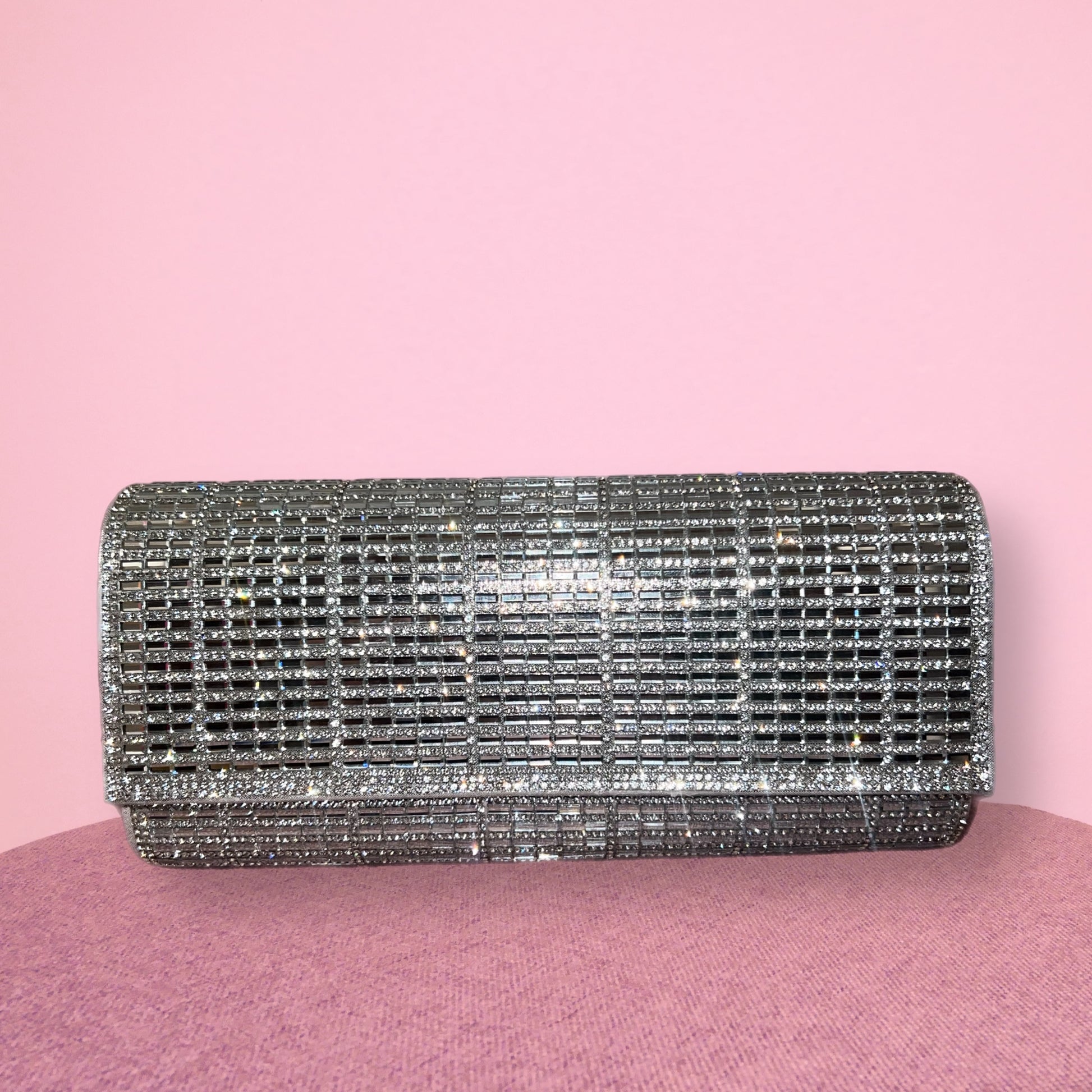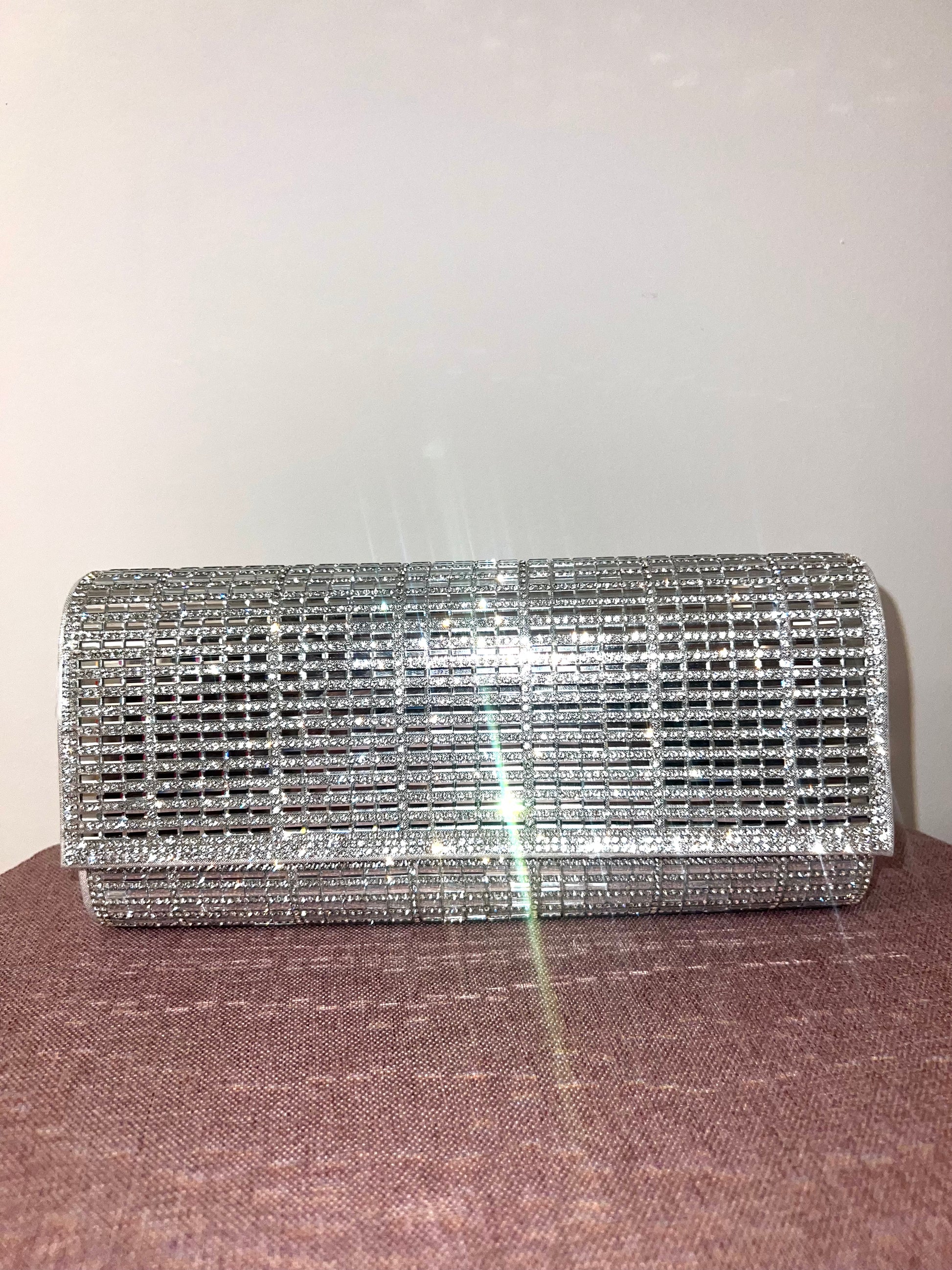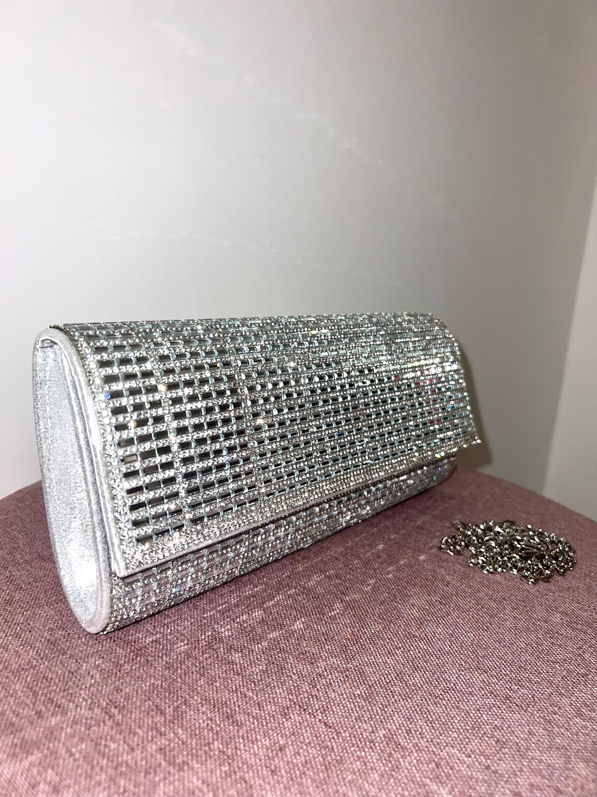 CLUTCH RETANGULAR CONFECCIONADA INTEIRA POR PEDRARIAS COM UM FECHAMENTO POR BOTÃO IMÃ. ACOMPANHA ALÇA PRATA REMOVÍVEL.