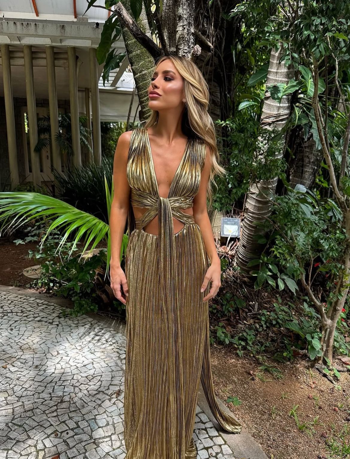 VESTIDO LONGO DOURADO EXCLUSIVO DA MARCA BY DUDA CURIMBABA, CONFECCIONADO EM LINDO TECIDO PLISSADO, SUPER FLUIDO E CONFORTÁVEL, DECOTE EM V, ALÇAS COM CAPA LONGA, RECORTE NA CINTURA, SAIA MODELAGEM RETA E FECHAMENTO POSTERIOR POR ZÍPER E BOTÕES.