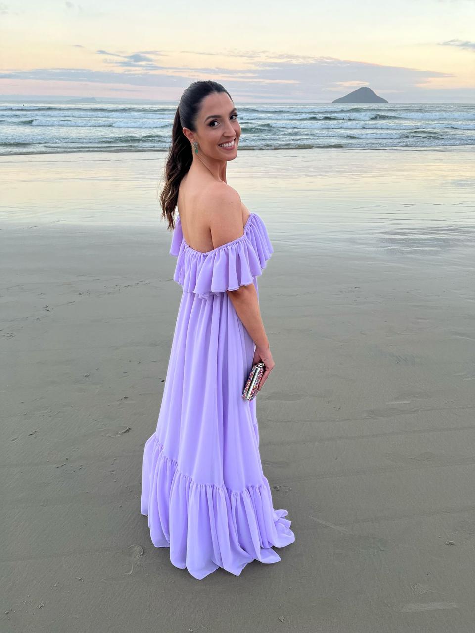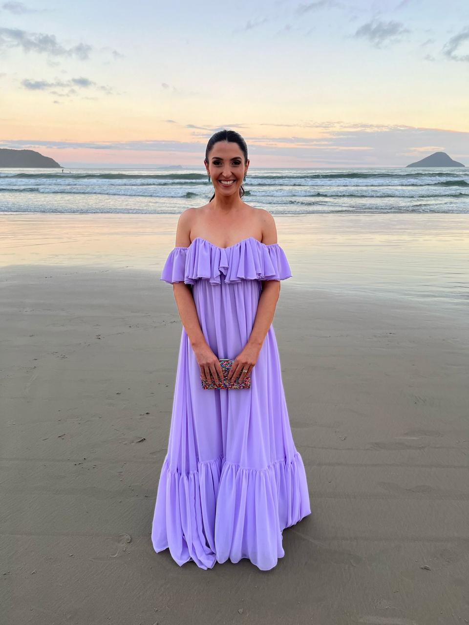 VESTIDO LONGO LILÁS DA MARCA BY DUDA CURIMBABA, CONFECCIONADO EM TECIDO FLUIDO, LEVE E CONFORTÁVEL, TOMARA QUE CAIA, BABADOS NO BUSTO E NA BARRA DA SAIA, SAIA EM FORMATO EVASÈ, FECHAMENTO POSTERIOR POR ZÍPER.