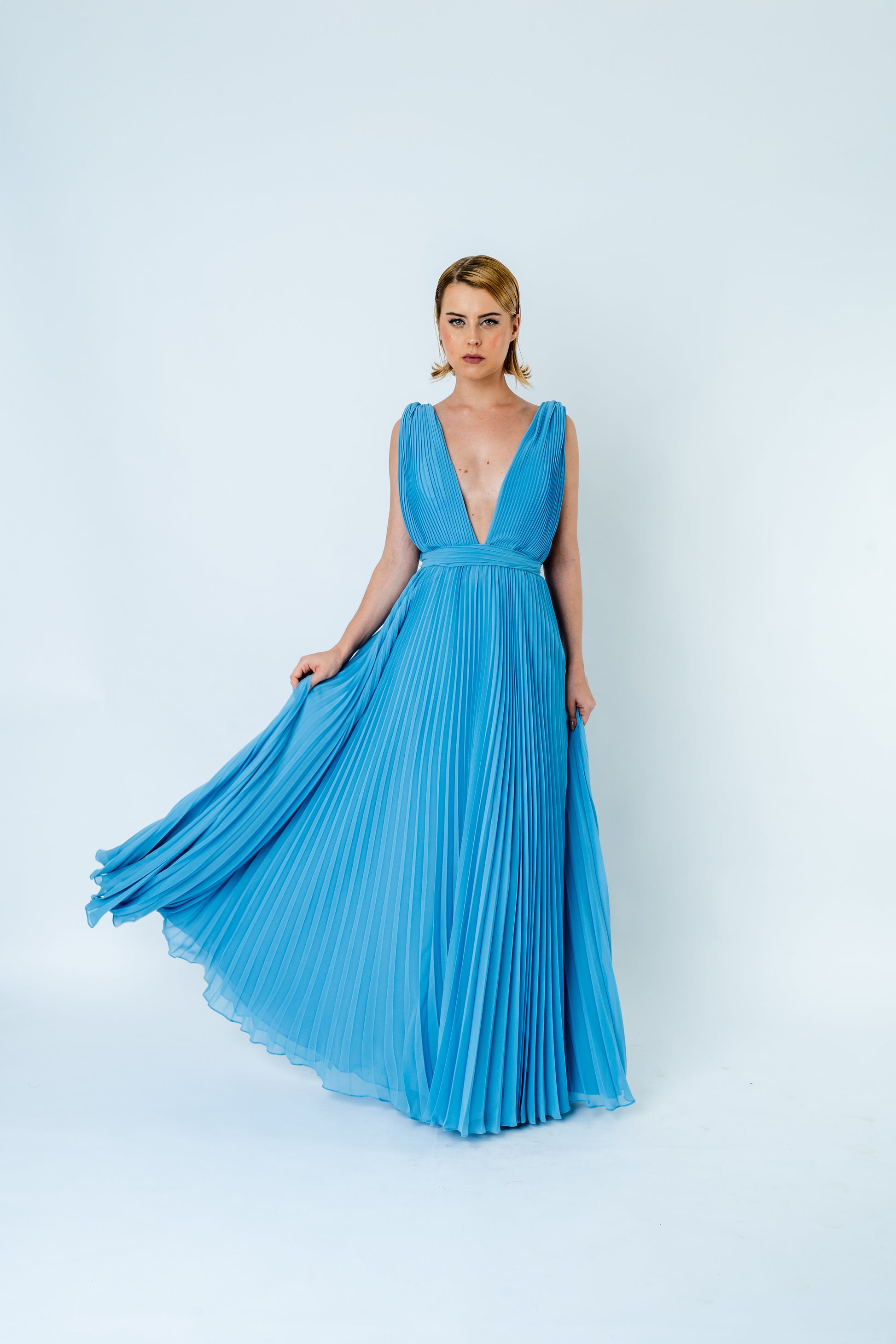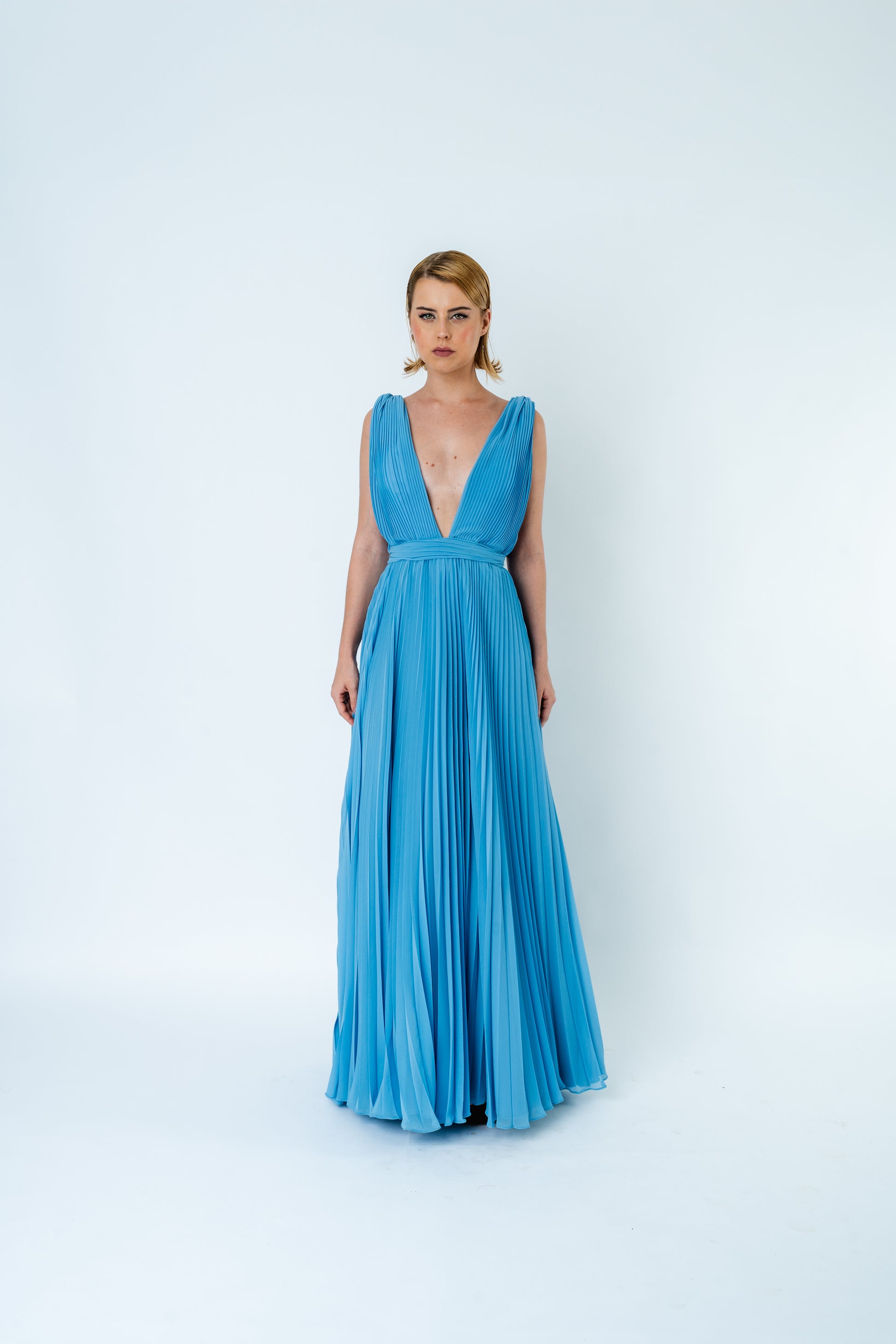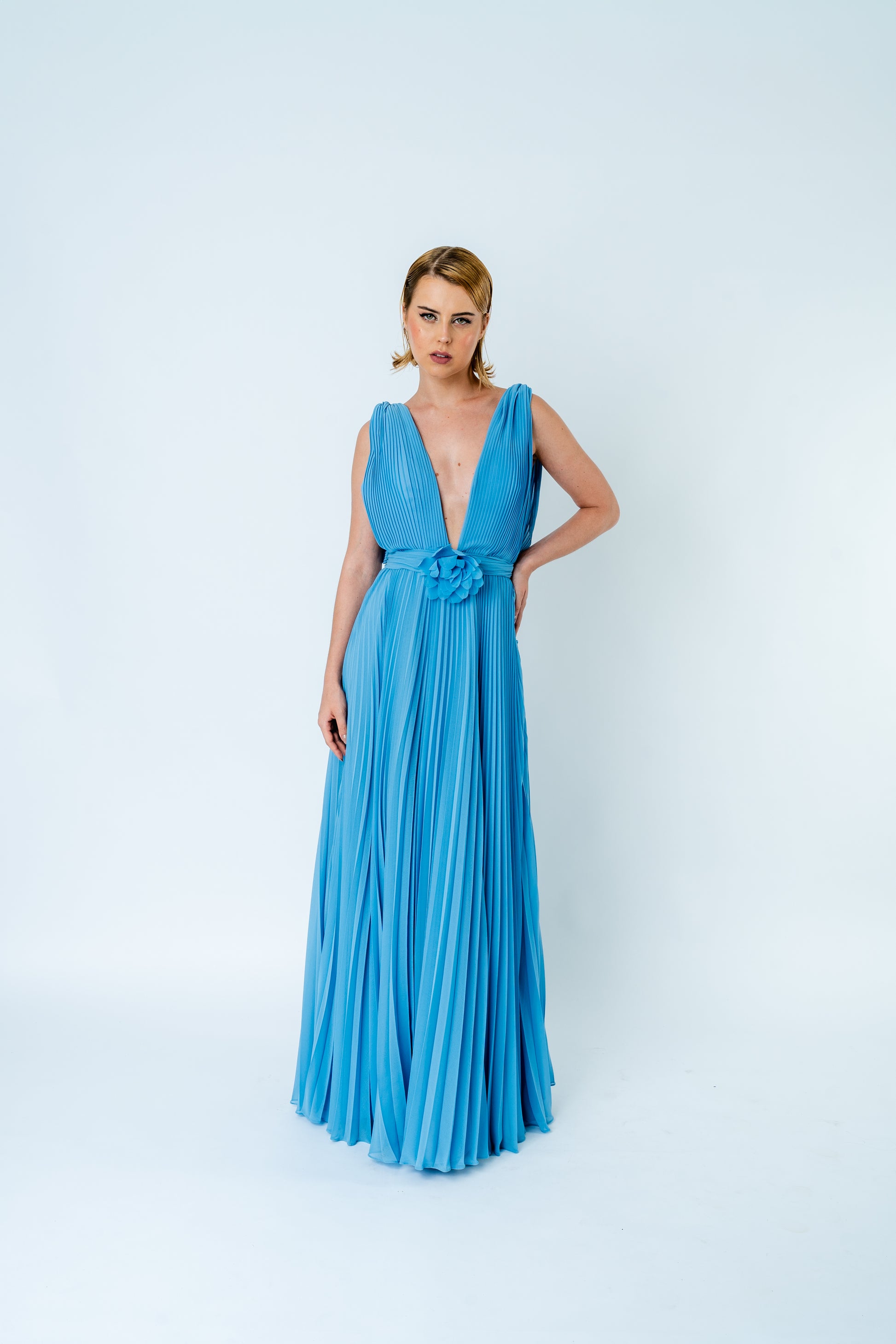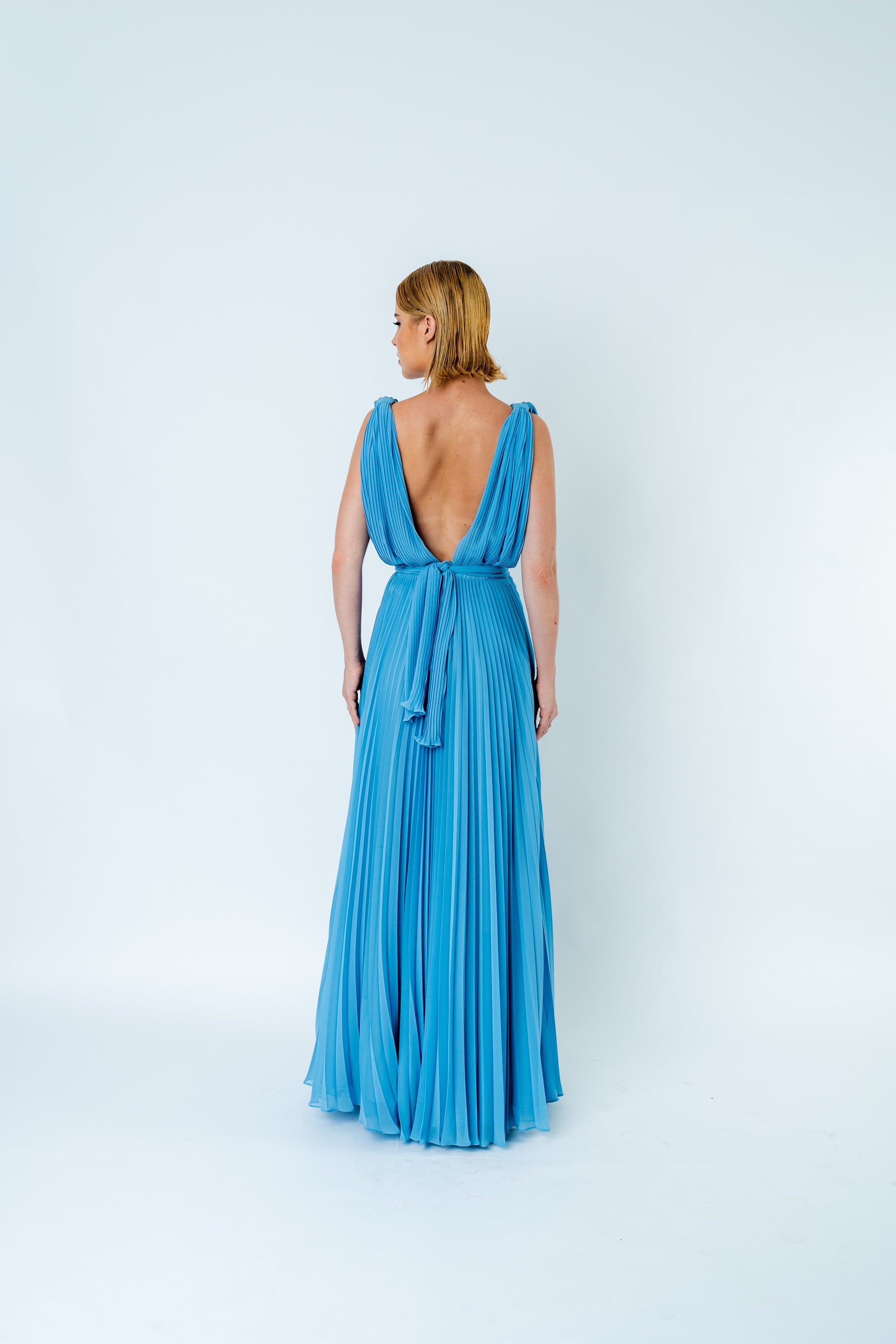VESTIDO AZUL EXCLUSIVO DA MARCA SOB MEDIDA SSWIPE CONFECCIONADO EM MUSSELINE TOQUE DE SEDA COMPOSTO POR DUAS PEÇAS PARA MELHOR AJUSTE. TOP COM ESTRUTURA INTERNA EM MALHA, COM DETALHE SOBREPOSTO EM MUSSELINE PLISSADO, SAIA PLISSADA EM MODELAGEM GODÊ COM BARRADO EM MUSSELINE.