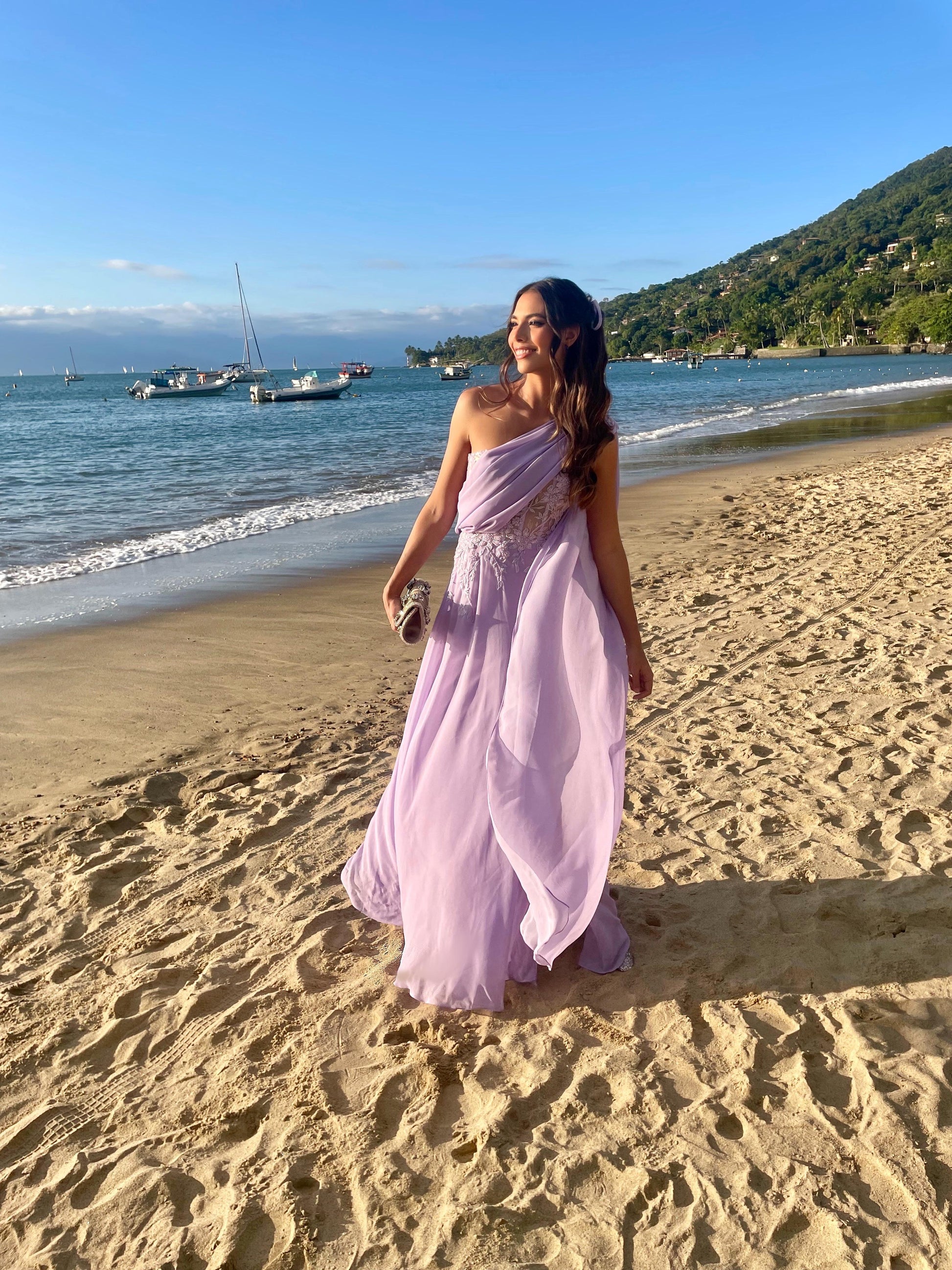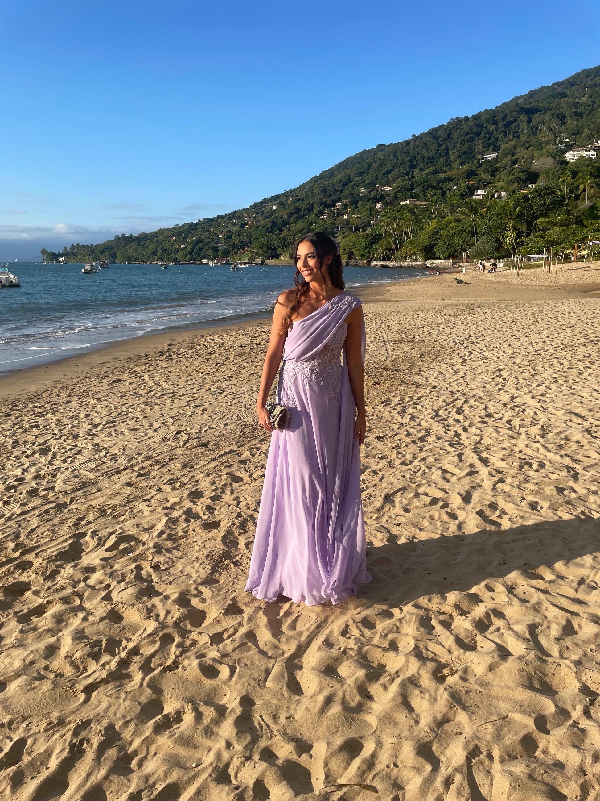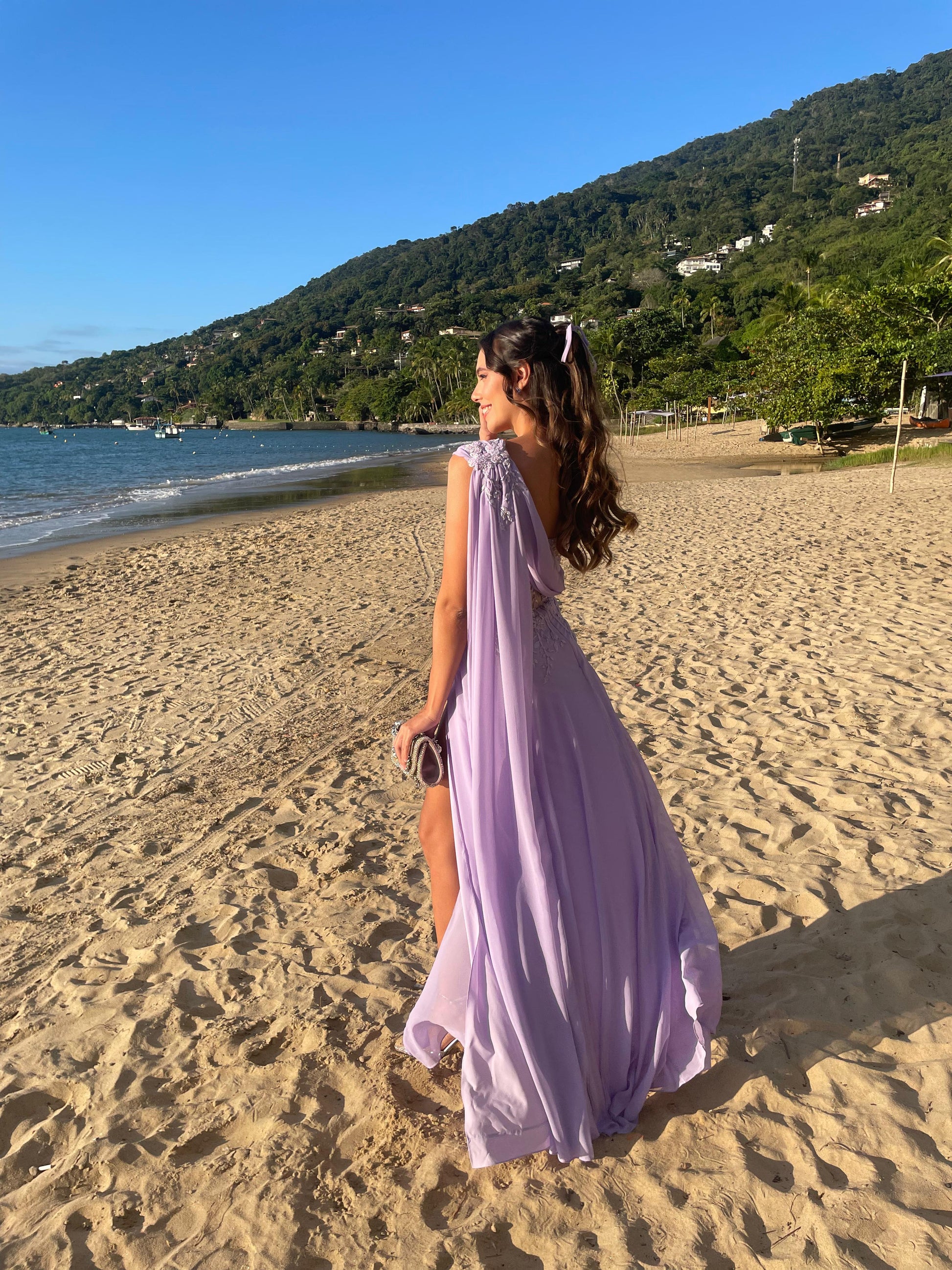 VESTIDO LILÁS LONGO FEITO SOB MEDIDA EM CONJUNTO COM A SZ FÊTE EM GGT TOQUE DE SEDA, DECOTE ASSIMÉTRICO, FENDA UNILATERAL E CAPA, ESTRUTURA DE CORSET, TULE COM BARBATANA APARENTE E LINDO TECIDO BORDADO APLICADO POR CIMA NO BUSTO, NA SAIA E NA CAPA, ZÍPER INVISÍVEL NAS COSTAS E CONTÉM FORRO.