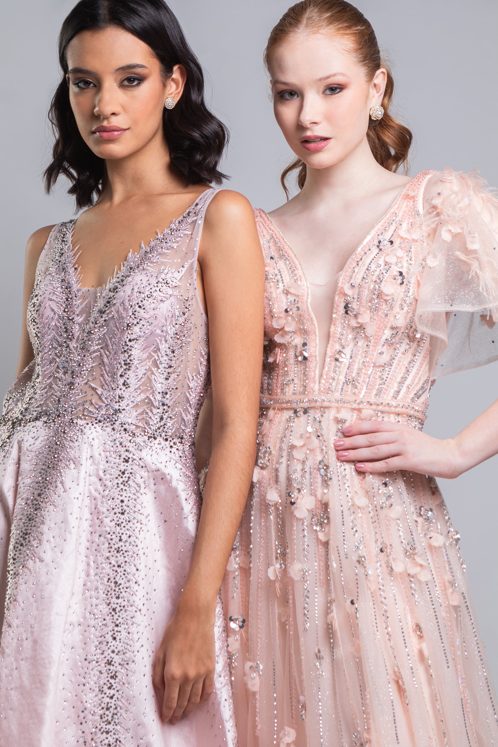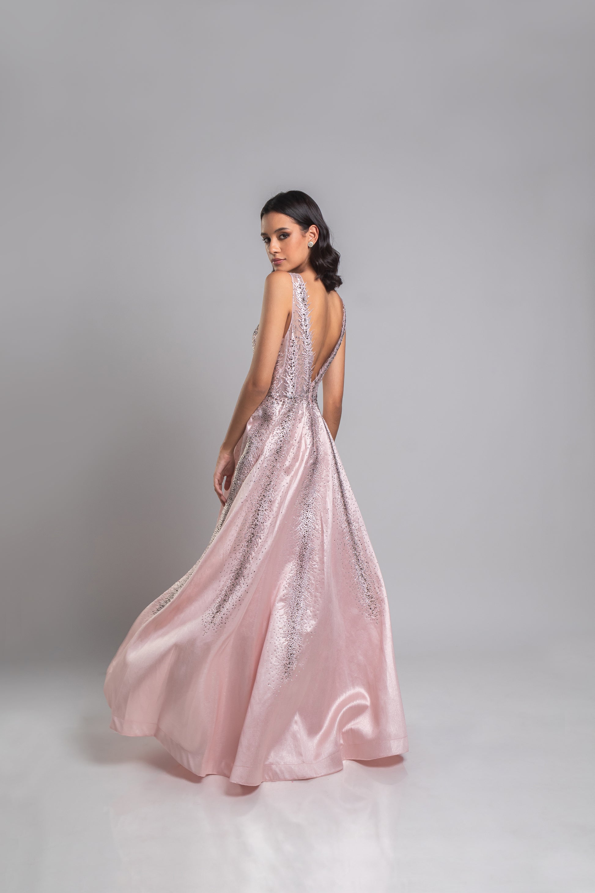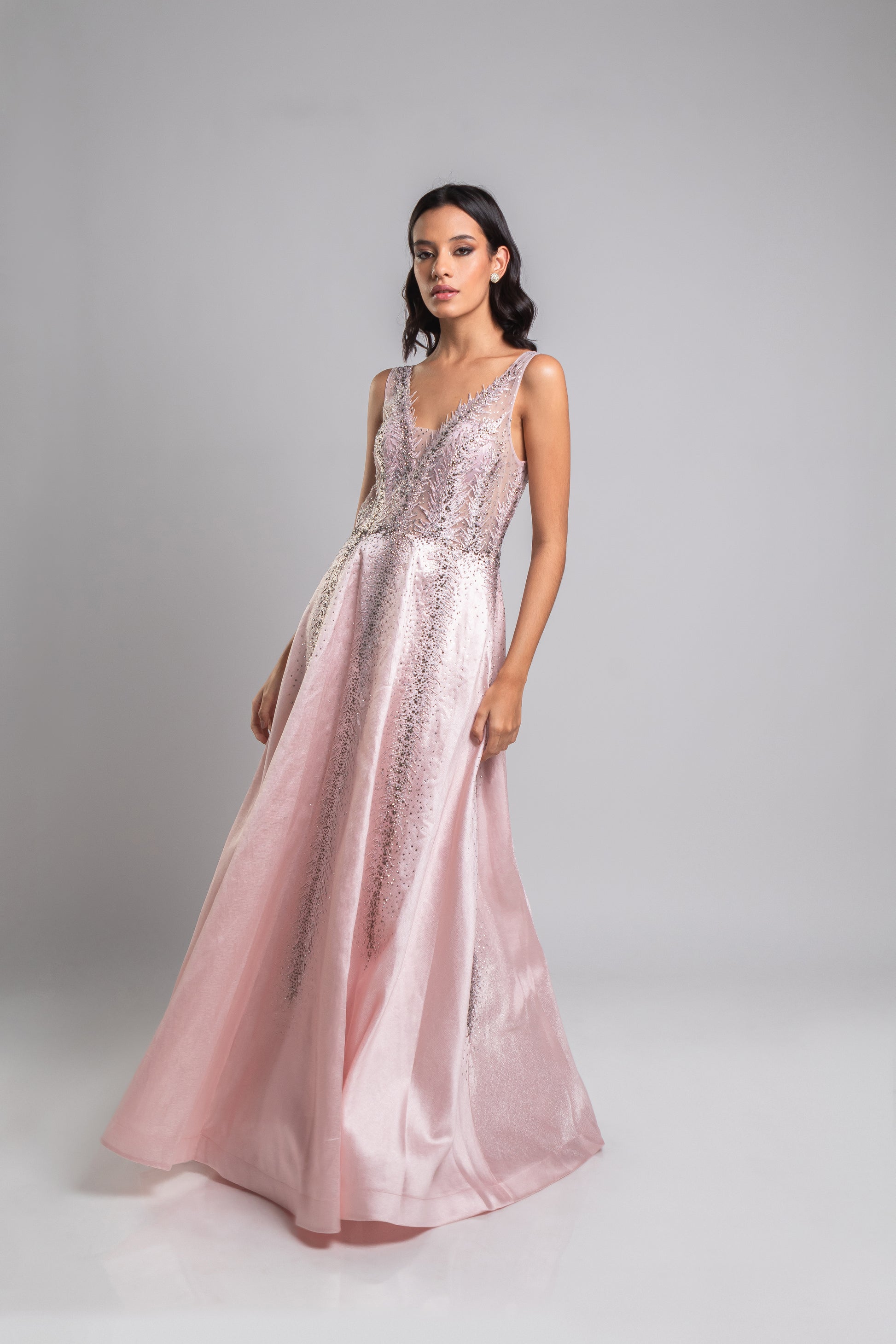 VESTIDO LONGO ROSA, CONFECCIONADO EM TECIDO ESTRUTURADO COM BORDADO EM PEDRARIA PRATA, DECOTE EM V, SAIA MAIS VOLUMOSA E FECHAMENTO POR ZIPER NO CENTRO COSTAS.
